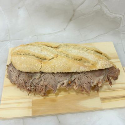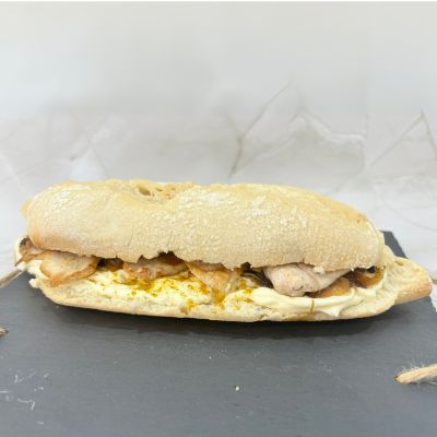 Bollo de pollo o lomo fresco con mayonesa, especies y cebolla a la plancha