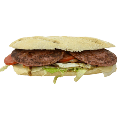 Bollo de hamburguesas con lechuga, queso, bacón, huevo, tomate, hamburguesa, mayonesa y especies