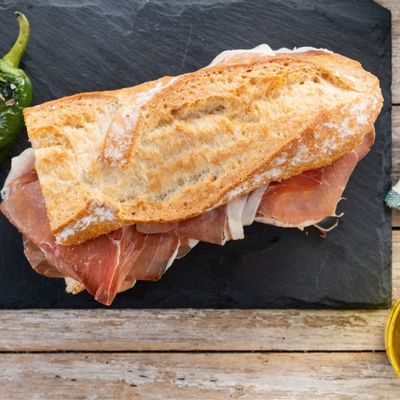 Bollo de pollo o lomo fresco con jamón serrano y pimiento